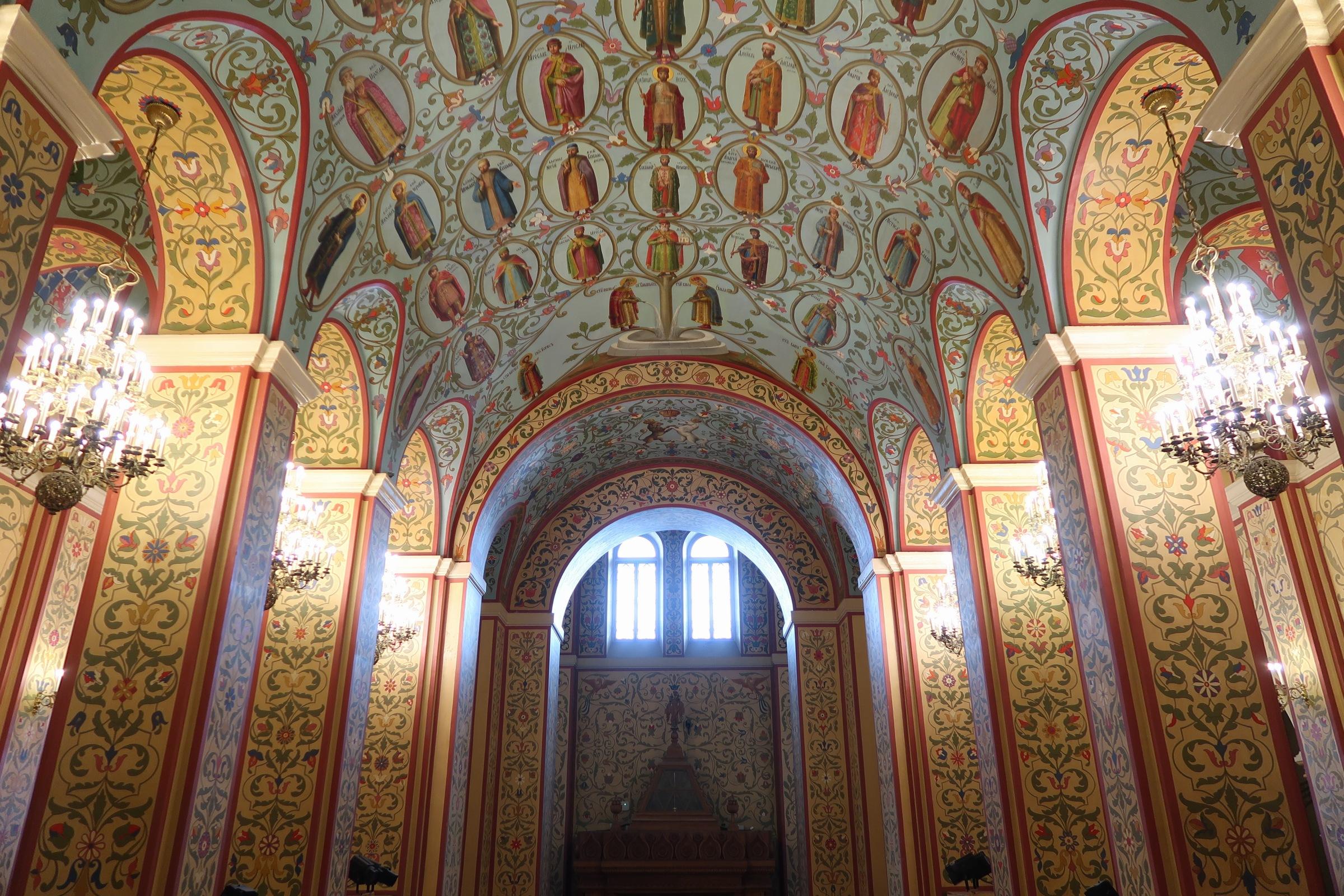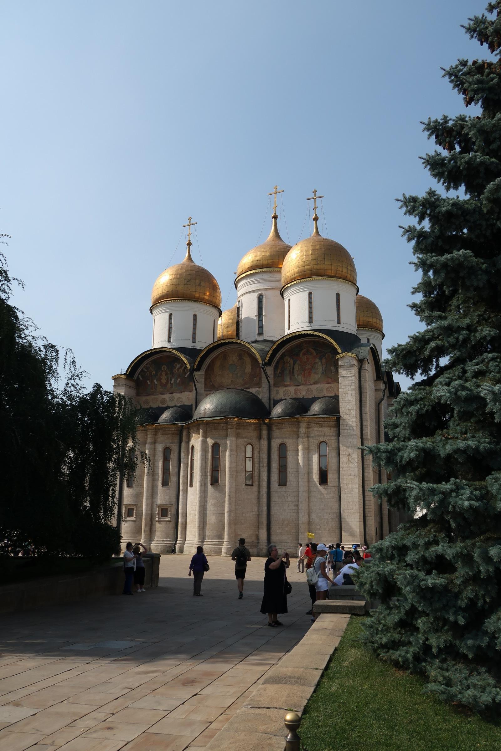 La visite a principalement porté sur la place des cathédrales. Fait notable : ce ne sont pas moins de 5 cathédrales que l’on peut visiter, chacune ayant une fonction particulière. L’une d’entre elles sert par exemple de nécropole aux princes de Moscou (XIIeme+) ainsi qu’aux premiers Tsars (la Russie ayant été unifiée en 1547 par Ivan IV) jusqu’au transfert de la capitale à Saint-Pétersbourg. Note : je vais finir par développer un 6eme sens à force de côtoyer tous ces morts…