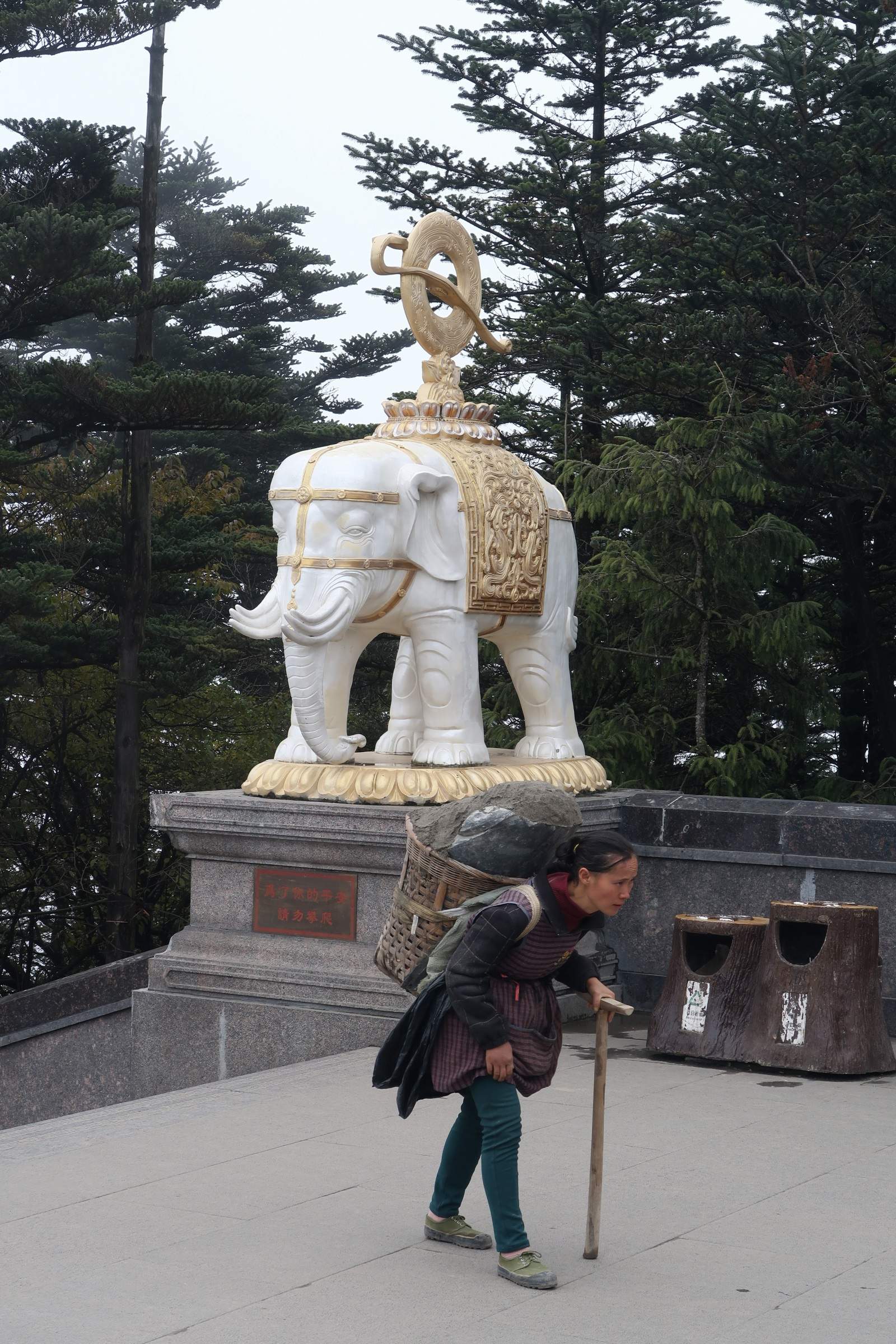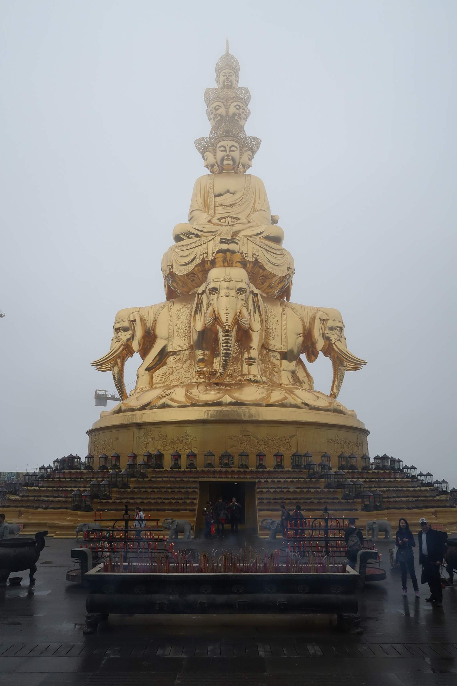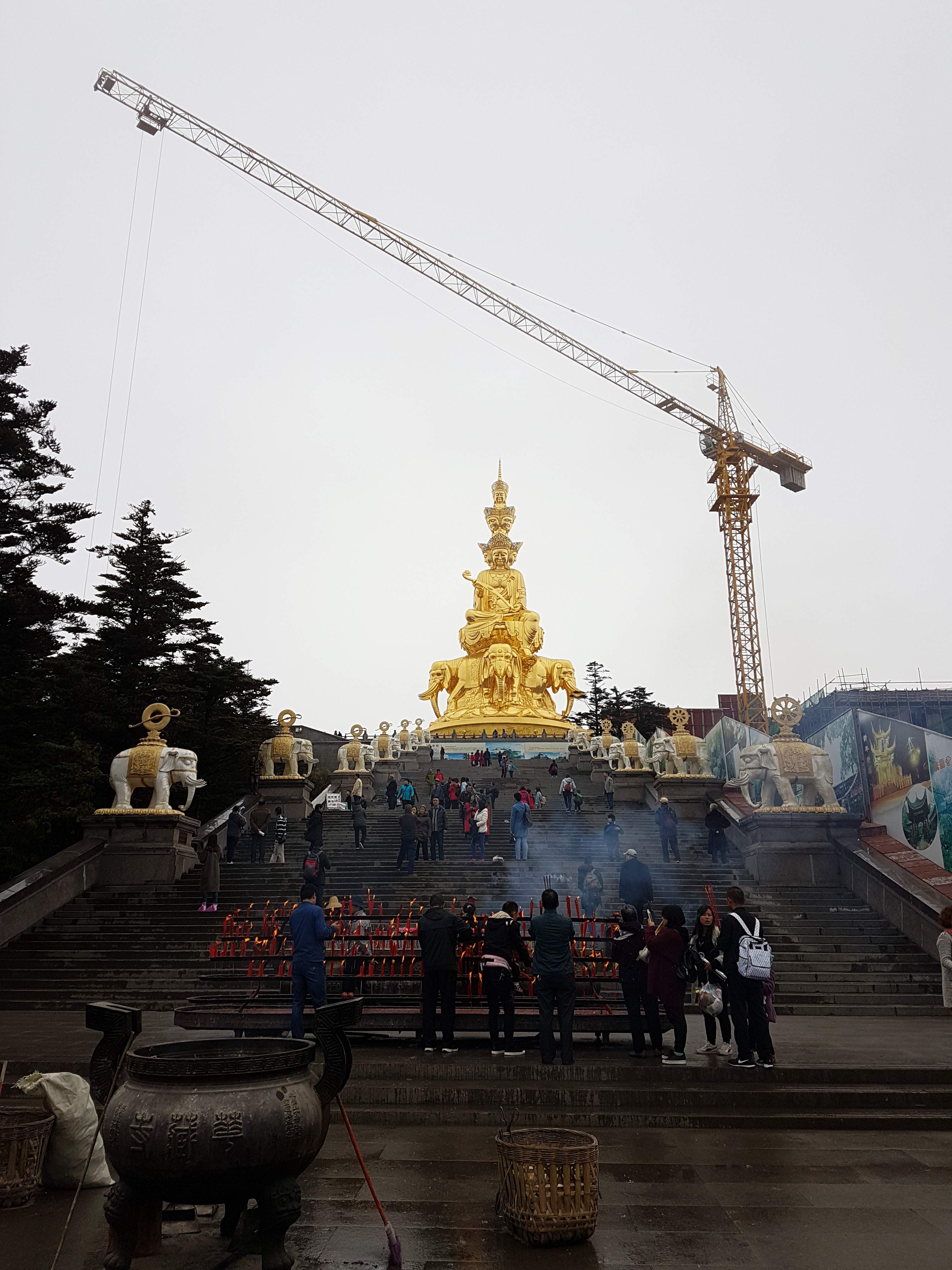 Le sommet était en plein dans les nuages (et en plein travaux 😲) lors de mon passage – c’est bête pour un lieu réputé pour offrir une très belle vue sur une mer de nuages, enfin passons – j’ai tout de même eu droit à un effet Waouh à la vue du totem élephantesque doré trônant en haut des ultimes marches ainsi qu’au temple derrière lui, doré également ; de toute manière tout là-haut était doré, intérieur et extérieur des temples, statues…