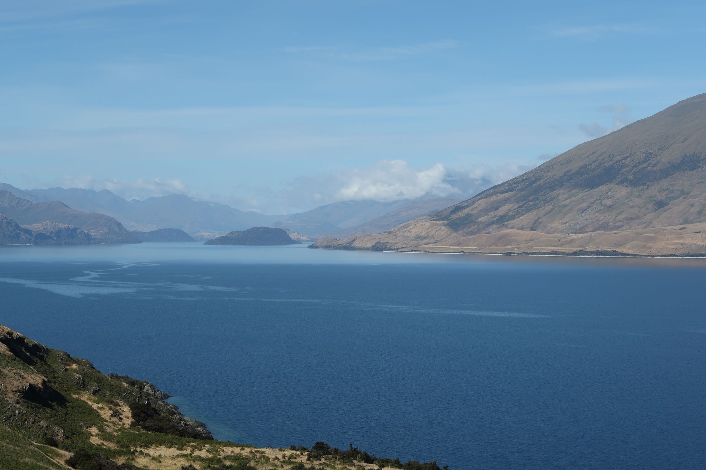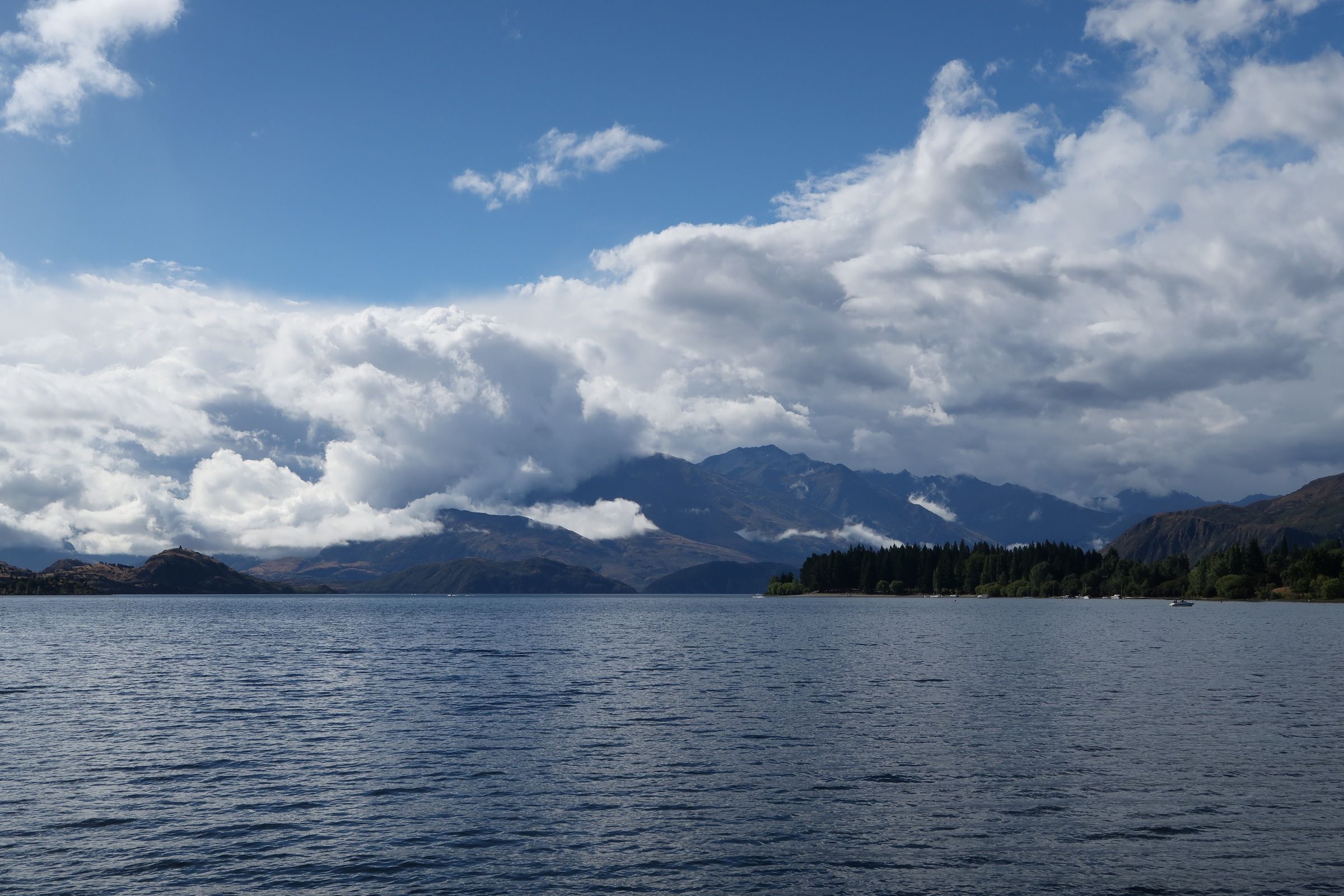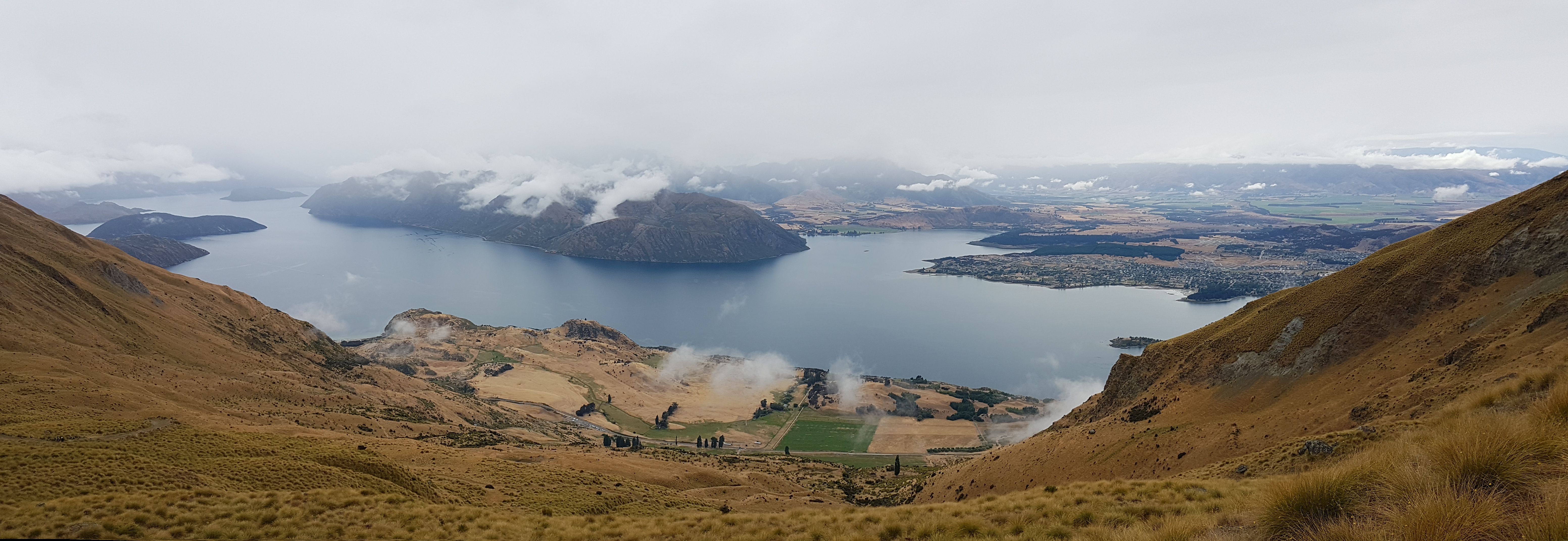 Vue sur le lac Wanaka avant l’ascension dans les nuages (la ville de Wanaka est à droite)