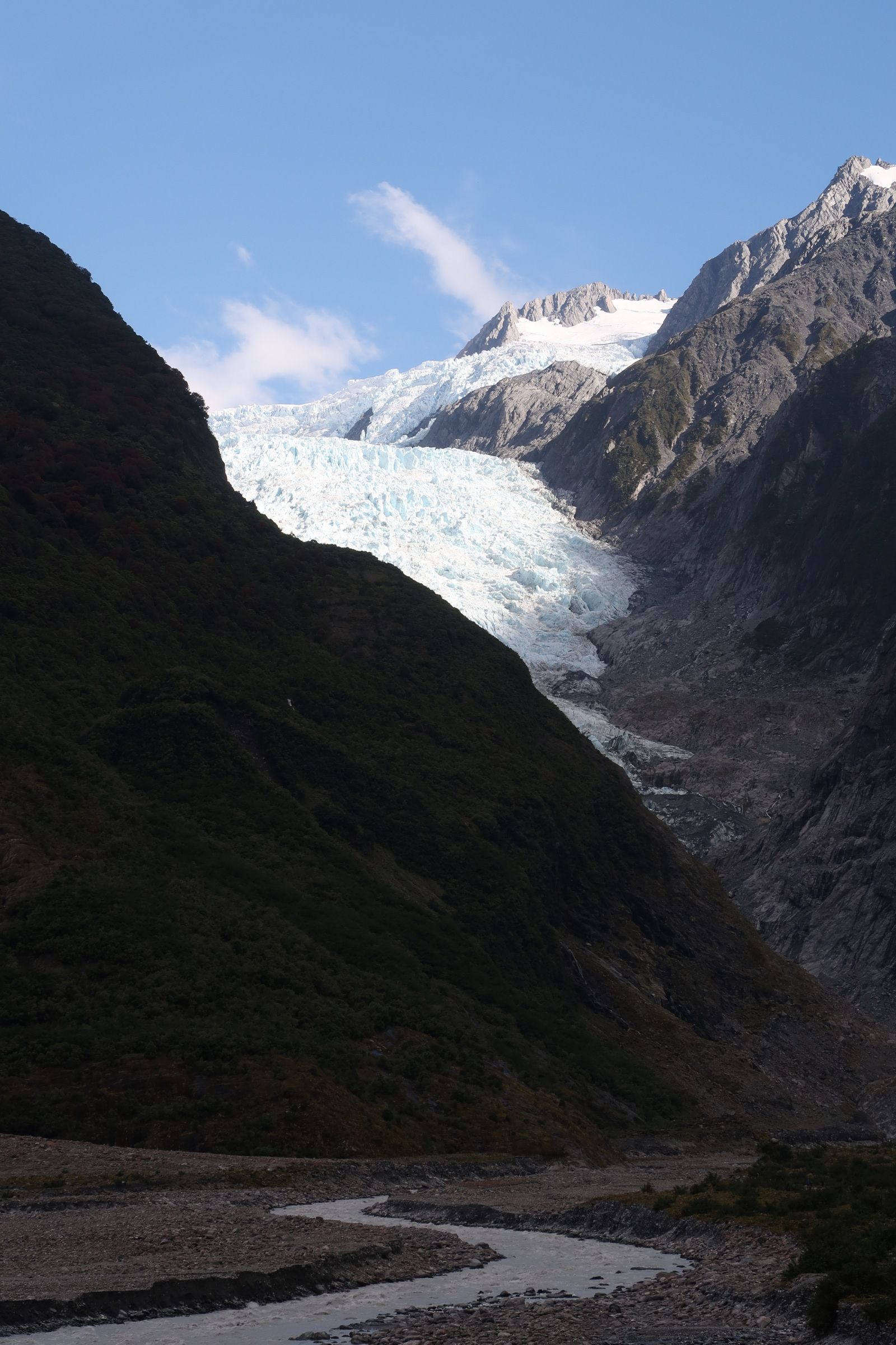 Je suis arrivé dans la zone des glaciers en milieu d’après-midi. J’ai préféré le Franz Joseph Glacier que le Fox Glacier : plus impressionnant vu de loin (et de près aussi d’ailleurs). Hélas leurs dimensions sont dans les deux cas ridicules comparées à celles d’il y a encore 10 ans…