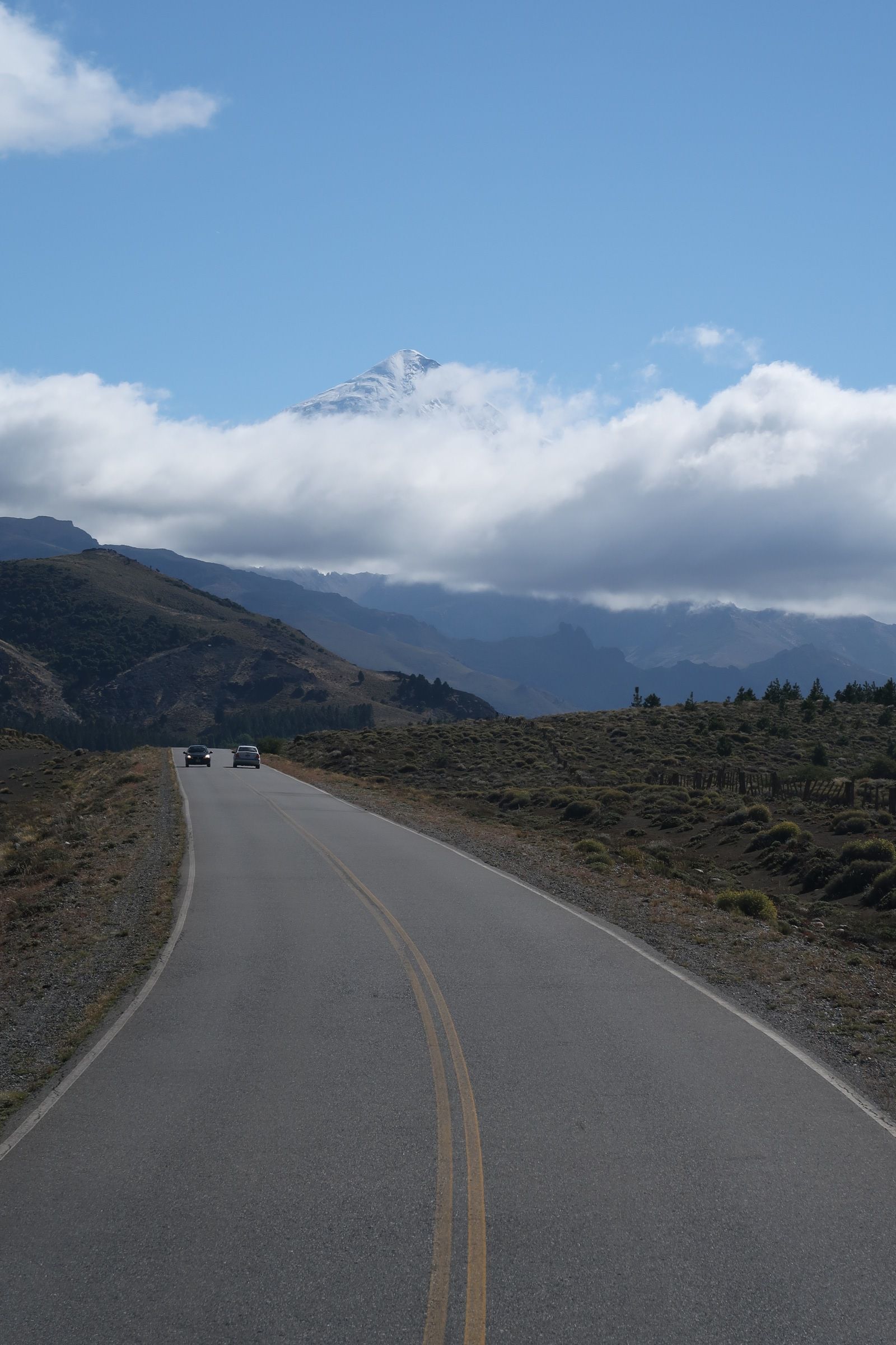 Encore une journée sur les routes. Cette fois j’ai pris les devants – c’est le cas de le dire – en réservant une place à la première rangée du bus ; j’ai donc eu droit à une jolie vue sur le parc Lanin, son volcan (du même nom) et ses forêts d’araucanias (des conifères locaux). La vue sur le volcan – dont le sommet est sur la frontière – fait son petit effet.