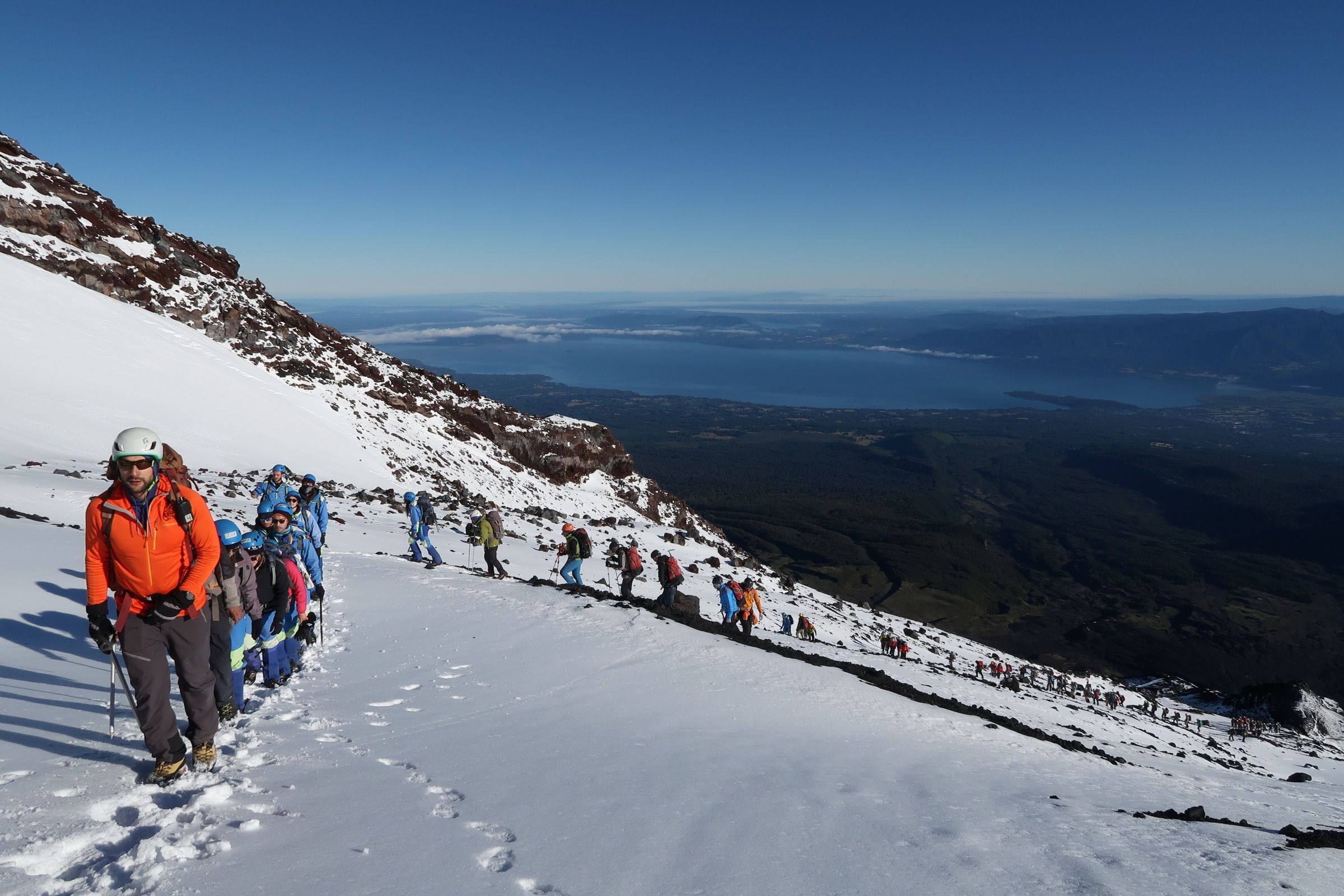 7h30 : après un court trajet en minibus nous arrivons au point de départ. C’est noir de monde, le temps a été mauvais les jours précédents, toute la ville semble s’être donné rendez-vous au pied du volcan. On prends un télésiège pour gagner une heure de souffrance inutile et maximiser nos chances d’arriver au sommet assez rapidement.