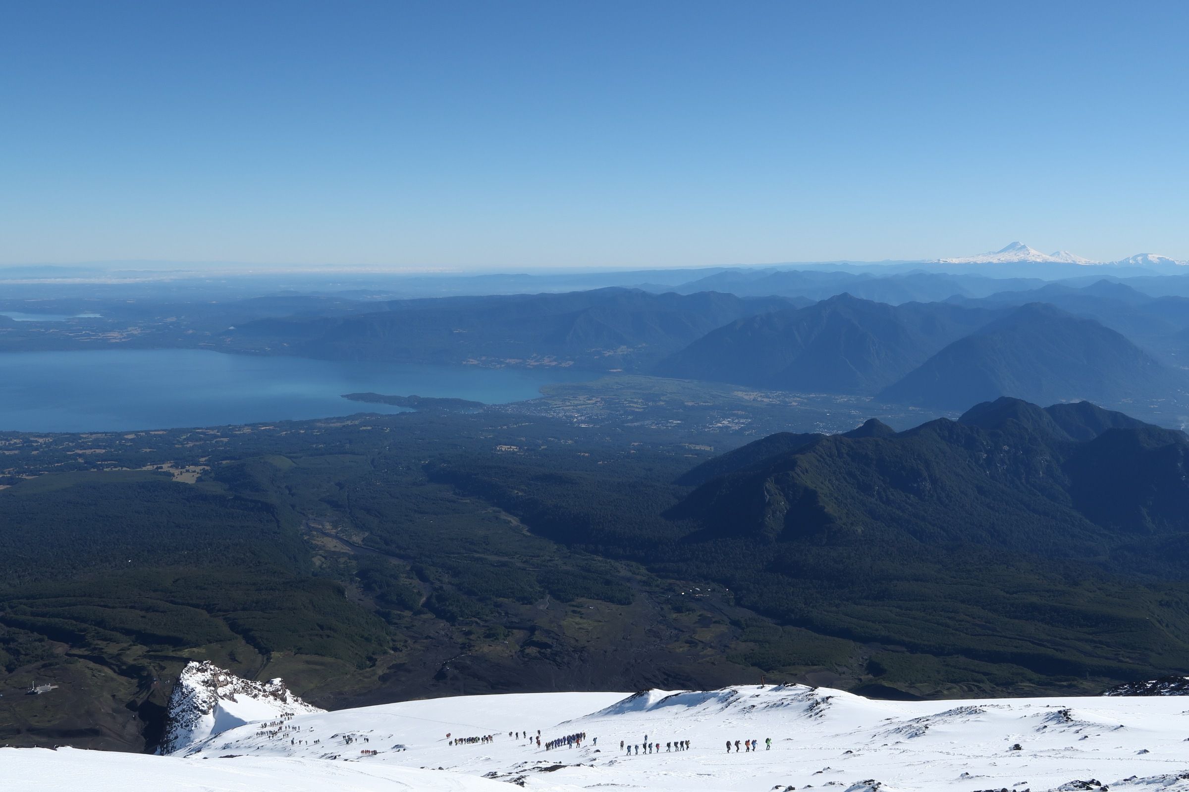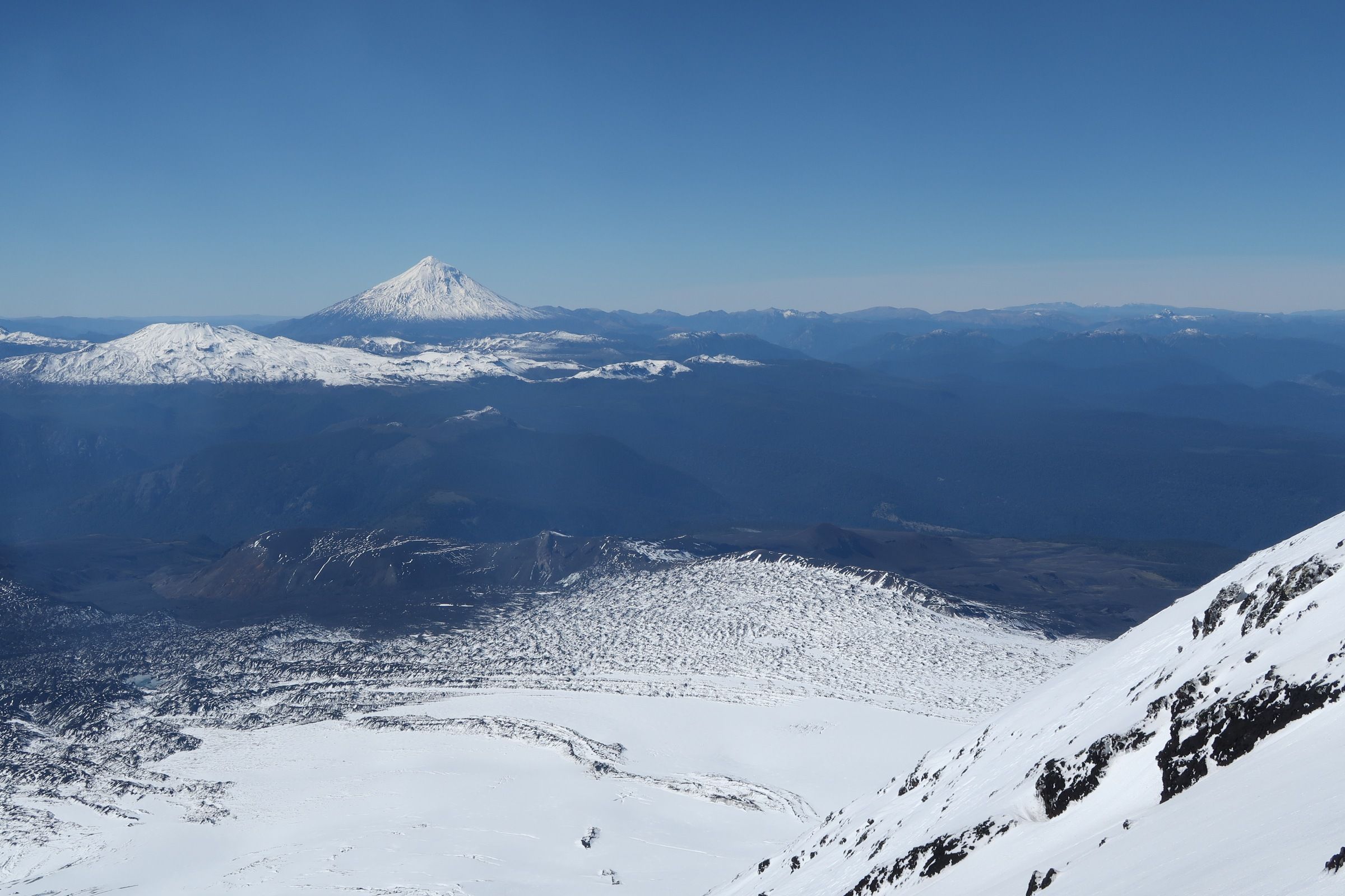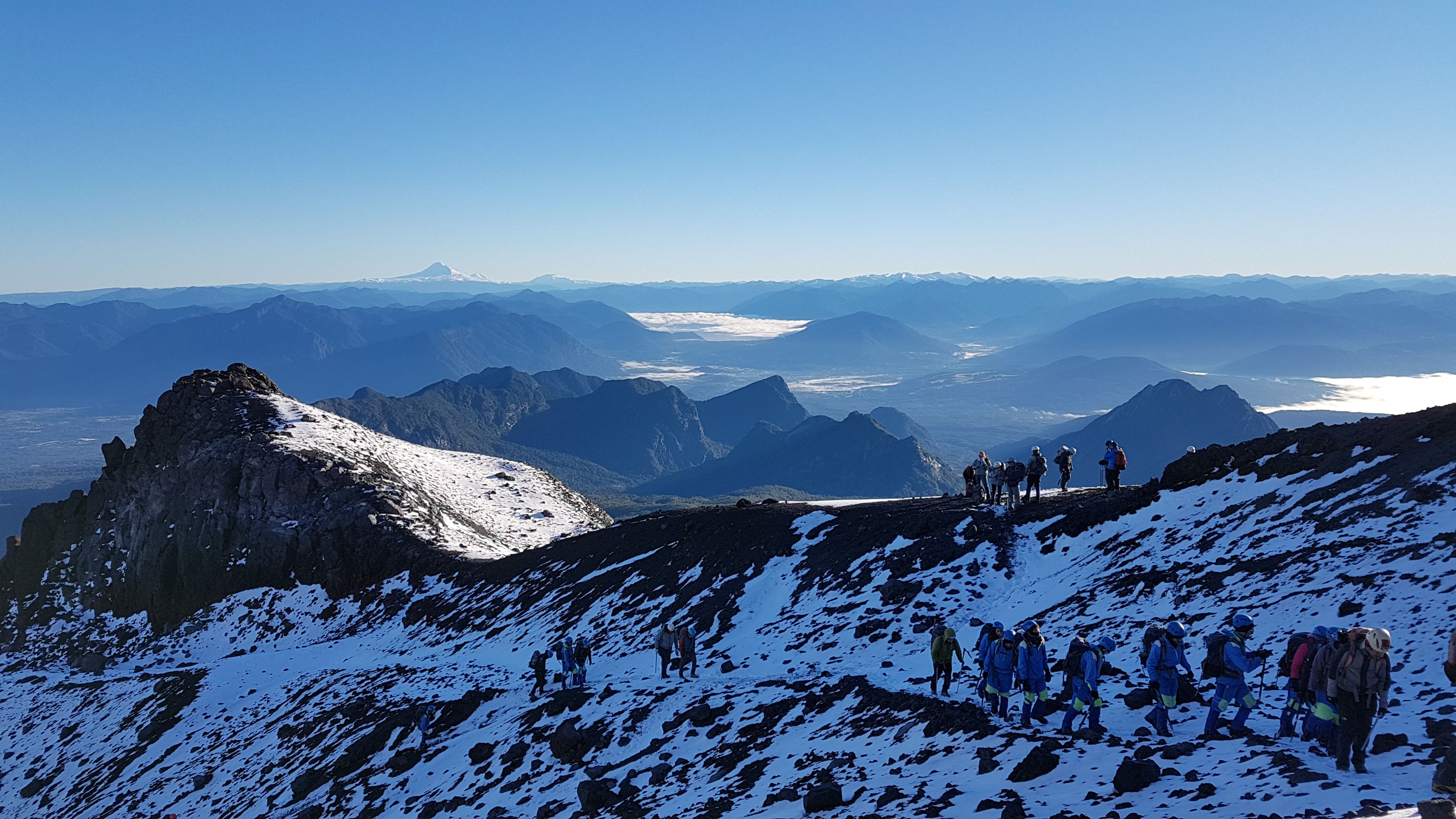 12h : on passe un petit quart d’heure au sommet ; le temps d’inhaler un peu de soufre au dessus sur cratère (le volcan est un des plus actifs du Chili) et de se décrocher la rétine sur le paysage de la cordillère. On redescend ensuite prendre nos sacs et manger un peu.