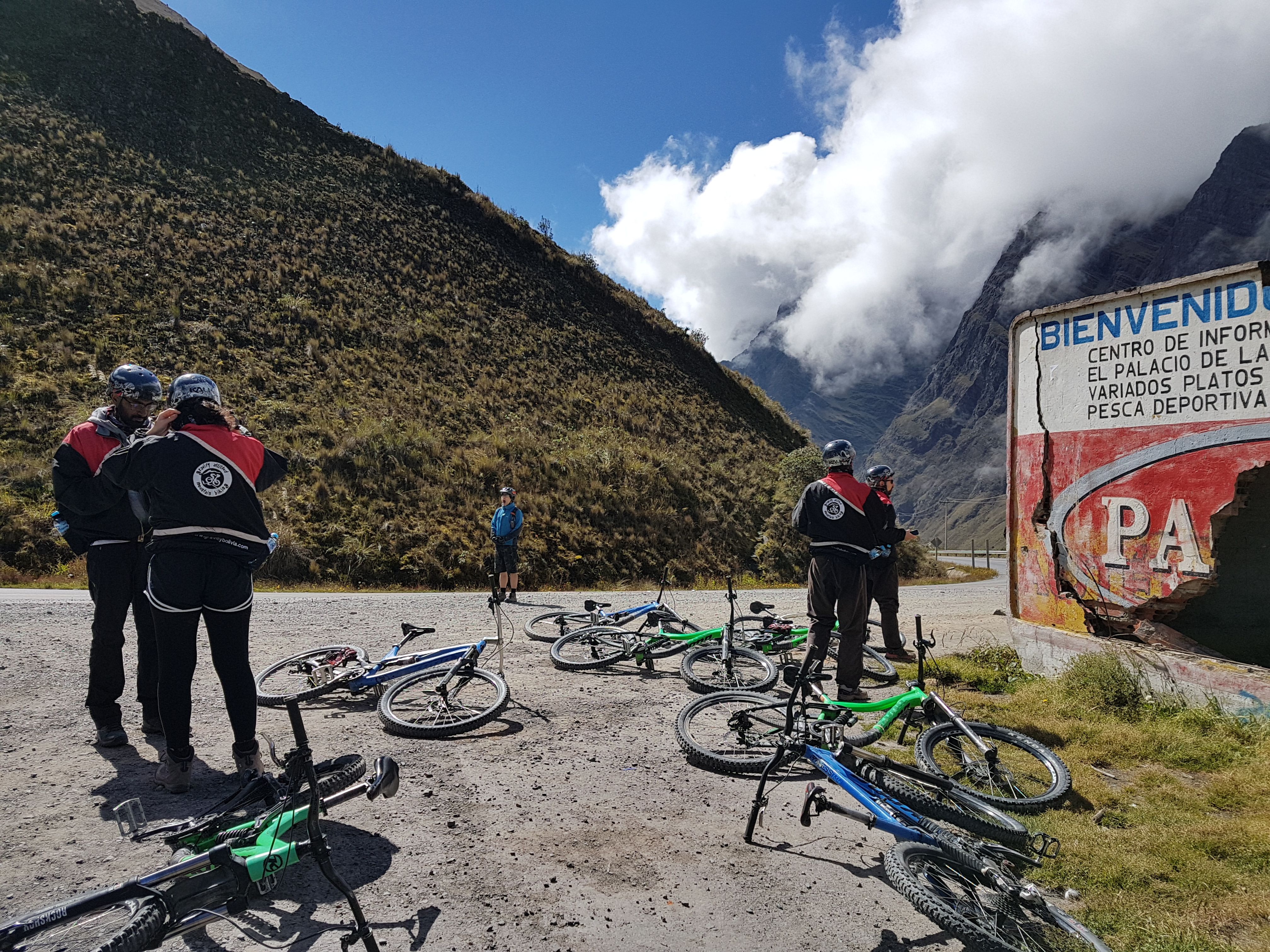 Avec 10 autres touristes, 2 guides anglophones et 1 chauffeur, on part de La Paz en minibus – les vélos sur le toit – et on fait un premier arrêt à La Cumbre (à environ 1h de route) où l’on se familiarise avec le matériel sur une route bitumée.