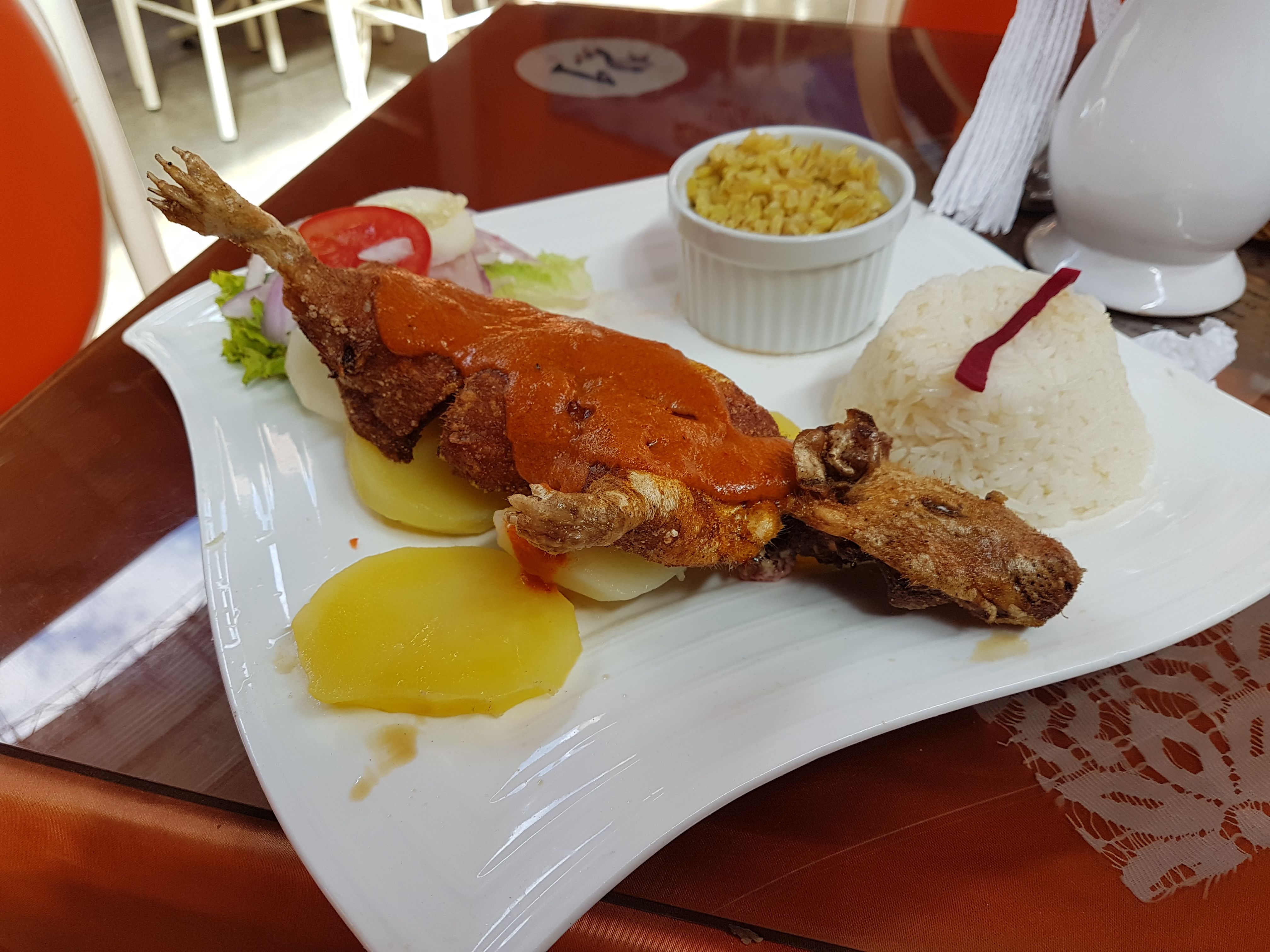 Pendant la pause déjeuner sur le chemin du retour je joue avec ma vie : je commande enfin mon premier « gui » (a.k.a « guinea pig », une spécialité péruvienne) ; peu goutu (ou étais-je trop concentré pour ne pas tout rendre ? 🤔).