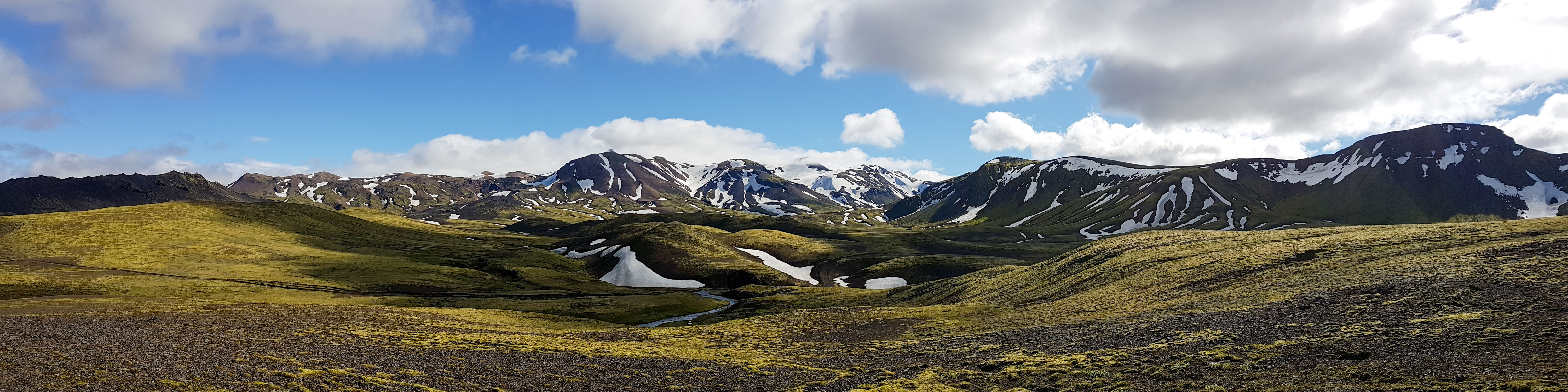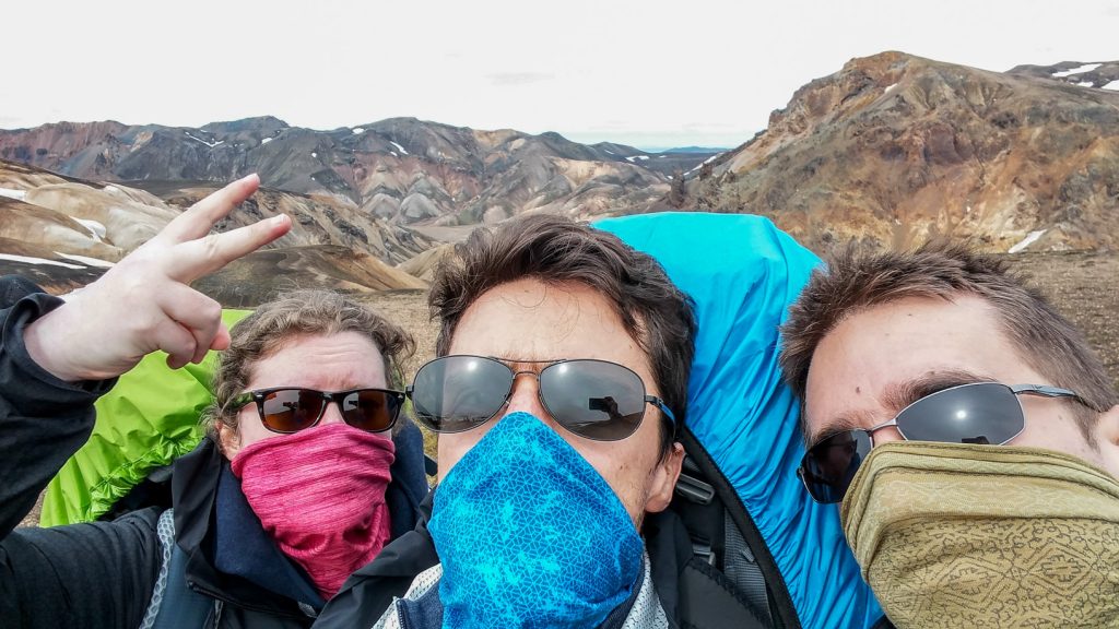 Après une nuit passée au point de départ du trek – que nous parcourons du Nord au Sud – nous entamons les hostilités ; et là c’est la fête : en quatre jours nous passons par des montagnes enneigées et des plaines recouvertes de roche volcanique, devant des geysers (et leur bonne odeur de soufre), sur des versants plus ou moins verdoyants (ici, les arbres ils ne connaissent pas) ou encore à travers des rivières dont l’eau – glacée bien sûr – nous arrive parfois jusqu’aux genoux.