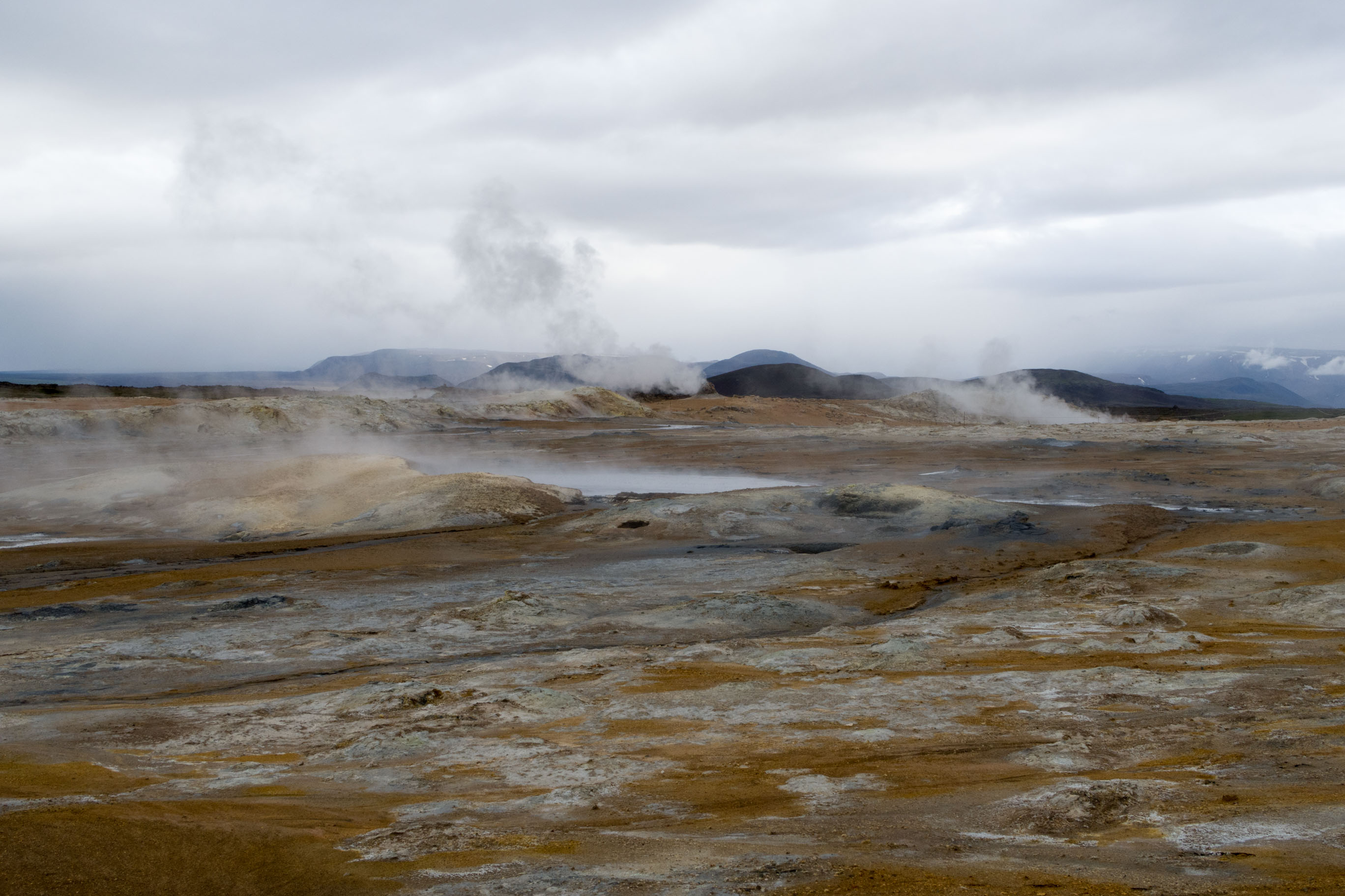 Après une nuit passée au point de départ du trek – que nous parcourons du Nord au Sud – nous entamons les hostilités ; et là c’est la fête : en quatre jours nous passons par des montagnes enneigées et des plaines recouvertes de roche volcanique, devant des geysers (et leur bonne odeur de soufre), sur des versants plus ou moins verdoyants (ici, les arbres ils ne connaissent pas) ou encore à travers des rivières dont l’eau – glacée bien sûr – nous arrive parfois jusqu’aux genoux.